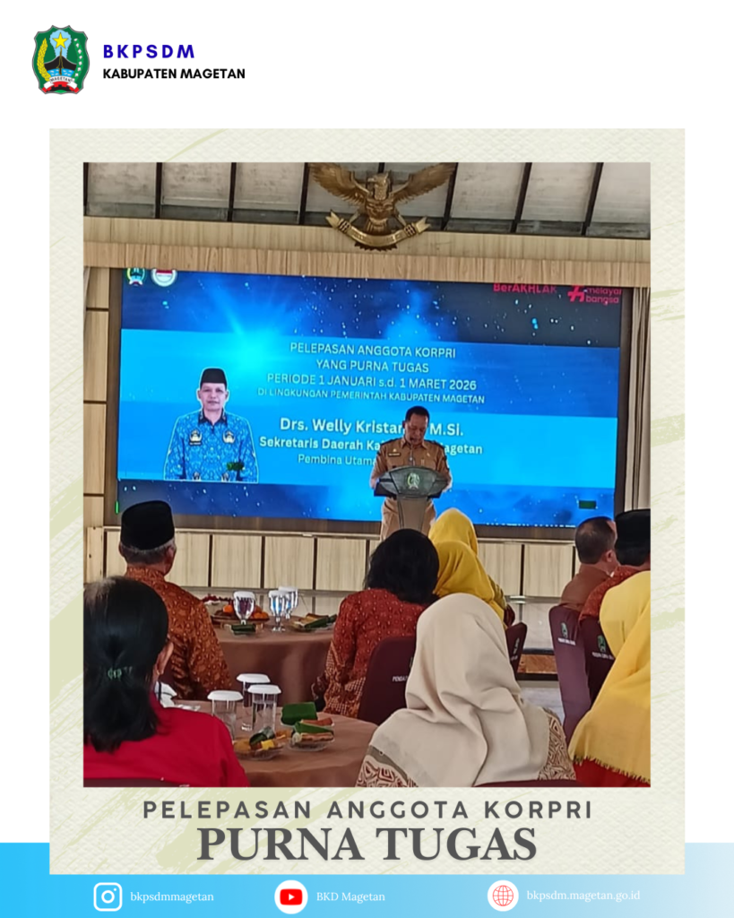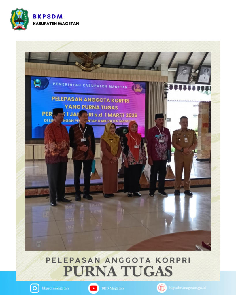 Seluruh keluarga besar BKPSDM Kabupaten Magetan mengucapkan: “Selamat memasuki masa purna tugas. Terima kasih atas dedikasi dan pengabdian mulia Anda bagi bangsa dan negara, khususnya bagi masyarakat Magetan.”